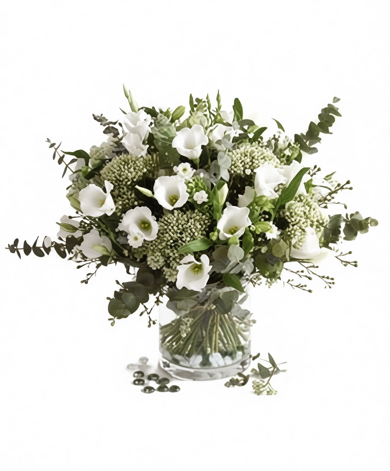 בוקט לבן וזך המשלב ליליות לבנות ,ליזינאטוס,אקליפטוס