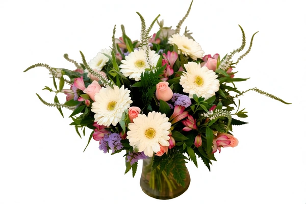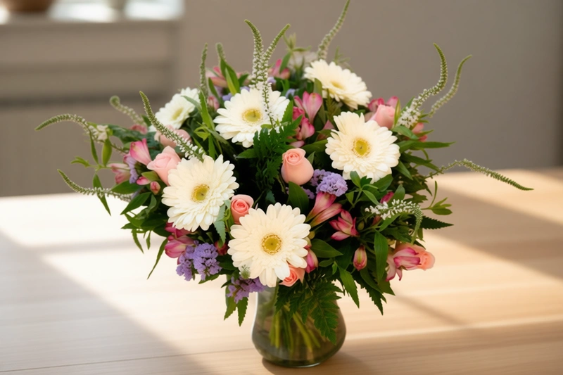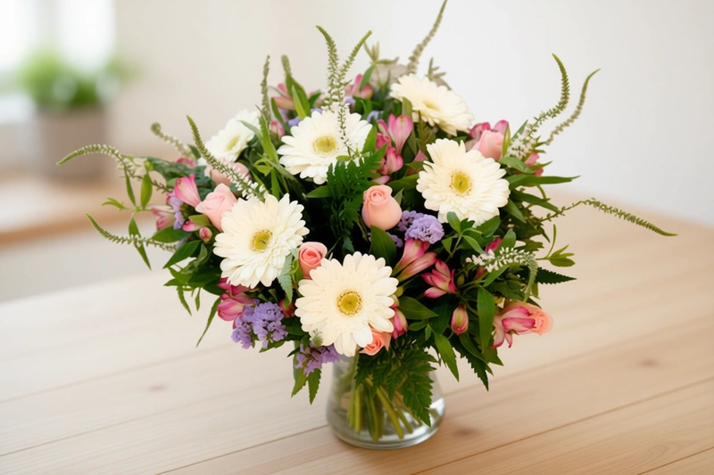 זר פרחים אביבי בגוונים של ורוד לבן מורכב מגרברות ליזיאנטוס ורוניקה וענפי קישוט